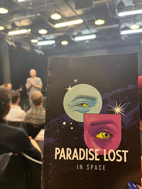 The producer’s reading was for a new musical called PARADISE LOST IN SPACE (which really should be called “Paradise Lost in Space… Jelly,” and I’m going to be making that case to the writer)… It was glittery and bombastic and the music was moving and filled with tight harmonies and the talent of the singers was over the top - the show is campy and funny and obscene and the message is novel and strong. I recommend it to anyone who loves a solid drag show that pushes boundaries.