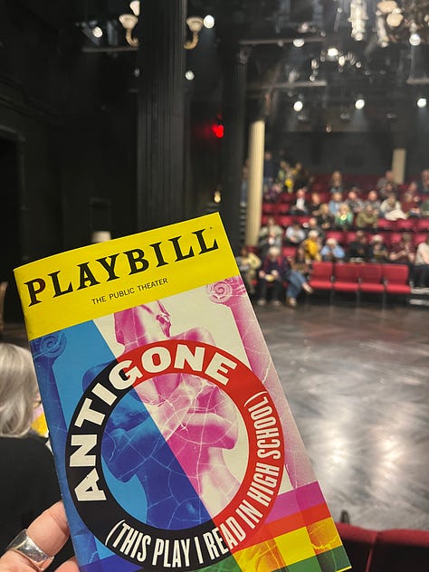 I also saw ANTIGONE (A PLAY I SAW IN HIGH SCHOOL) which is at the Public (coincidentally across the street from the venue where I saw the reading) - and in that play, a powerful, interesting, multilayered script with magnificent acting was derailed by the production choice of using copious amounts of stage blood on white costumes as a main focus to further heighten the already stratospheric drama of the show.